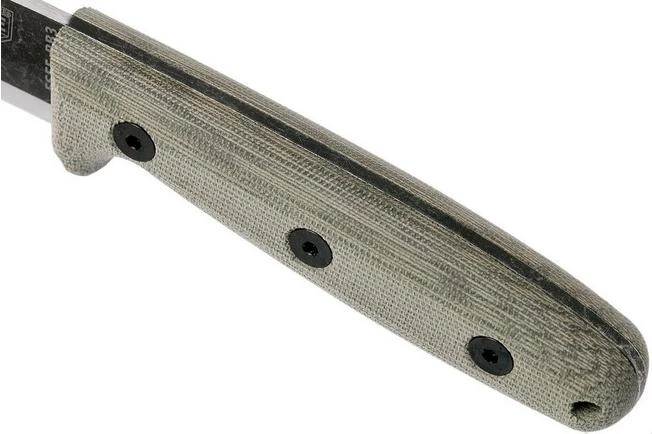 The ESEE RB3 is a very nice bushcrafting knife from the Camp-Lore series, designed by Reuben Bolieu. This knife is ideal for lighter tasks and fine wood-cutting. The micarta handle lies great in your hand, even when you have larger hands. It offers plenty of grip and helps to use the razor-sharp blade with exceptional precision. This blade is full-tang (which means it runs through the whole handle) and is made of 1095 carbon steel. Unlike many other carbon steel ESEE knives, this does not have a coating but has a stonewashed finish. This gives the steel a cool look, but makes it more susceptible to rust. Drying it thoroughly after use and the occasional drop of oil will work miracles for this knife. ESEE decided not to coat the knife so to allow users to create their own patina on the blade