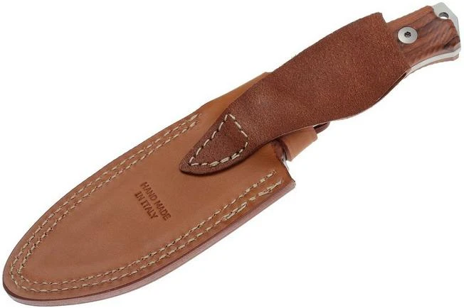 The LionSteel M5 is an all-round fixed knife. This knife can be used as a survival knife but it is also a great hunting knife. The Sleipner steel blade is hardened up to 60-61 HRC. The length of the blade of this knife is 11.5 cm. On the spine of the blade, around the transition of the handle, you find a small protrusion. So small you hardly notice it, but large enough to offer your thumb more grip. The entire spine has a lovely finish, something we often see on Italian knives. The Santos Palissander handle has a beautiful decor and subtle grip grooves. These give the knife a graceful and elegant look and feel.