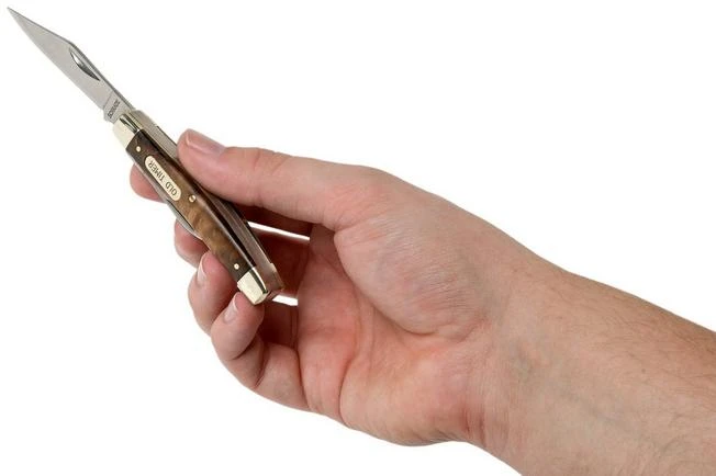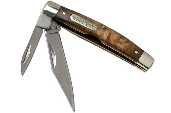The Old Timer 3″ Middleman 33OTW is an inexpensive slipjoint pocket knife, with a handle made from Desert Ironwood. A compact traditional with two blades: clippoint and pen knife. You open the blades with two hands and when opened, a slipjoint locks the blade. No real blockage, more of a resistance. Because of this, these knives can be worn in many places.