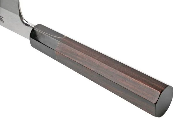 The Sakai Takayuki Blue 2 Steel Japanese Style 01255 kamagata usuba is a stylish Japanese vegetable knife. This kamagata usuba has a blade shape with the spine rounding off at the end of the blade towards the tip of the knife. This makes the knife very similar to a mix between a santoku and a nakiri. We don’t know the exact reason for this curve, but the knife is extremely suitable for finely slicing or chopping meat, fish and vegetables.