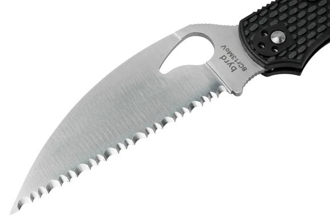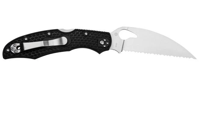 The Spyderco Byrd Cara Cara 2 Wharncliffe is a handy pocket knife for everyday use. Instead of the classic blade shape, this blade is a Wharncliffe. This is a variant of the sheepsfoot, but with a straight edge. This version has a serrated edge. Perfect for opening boxes.